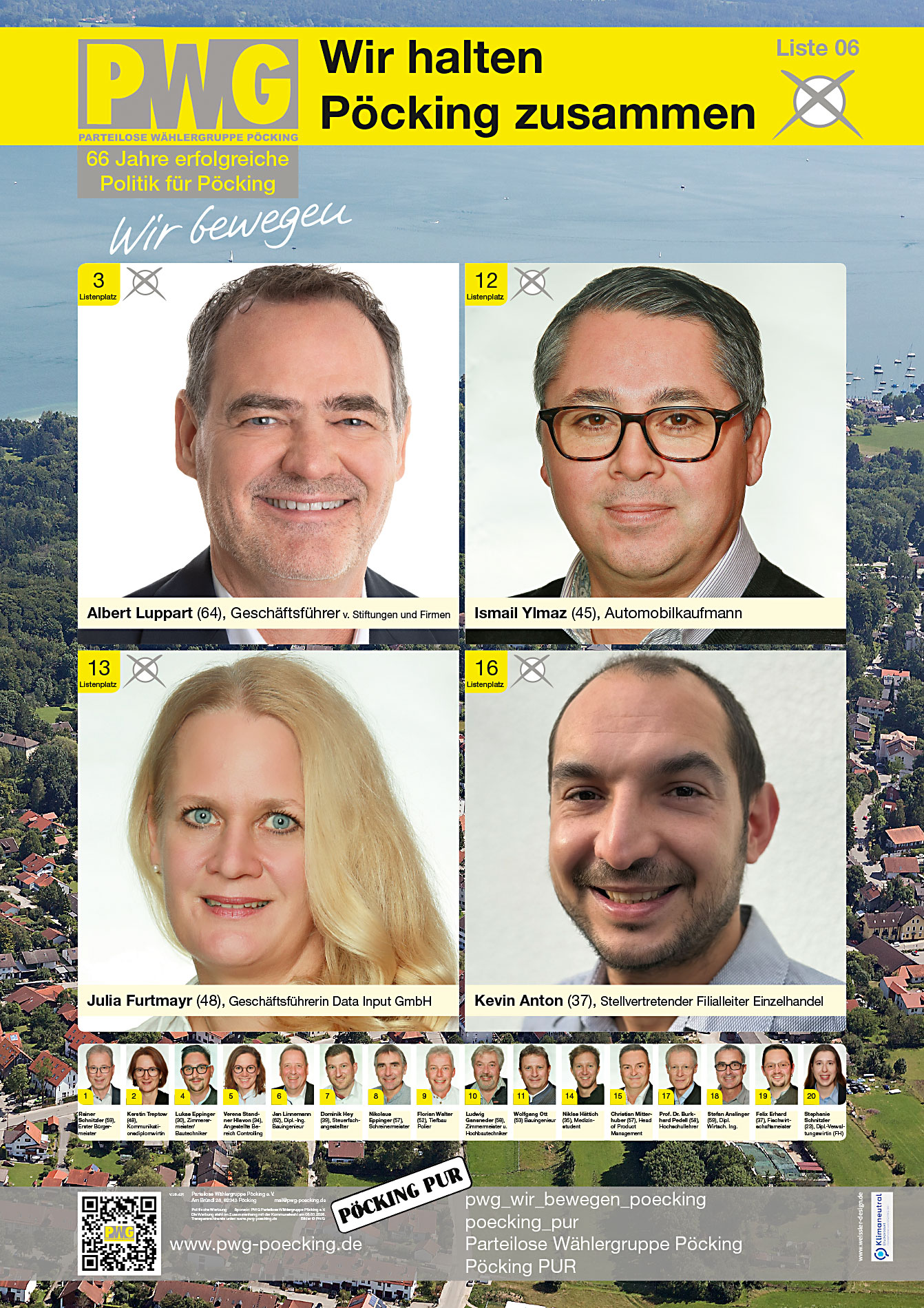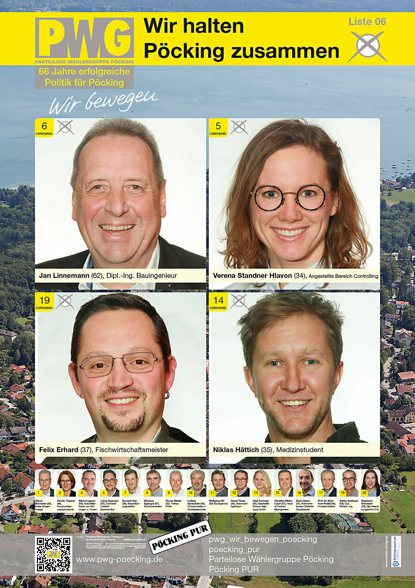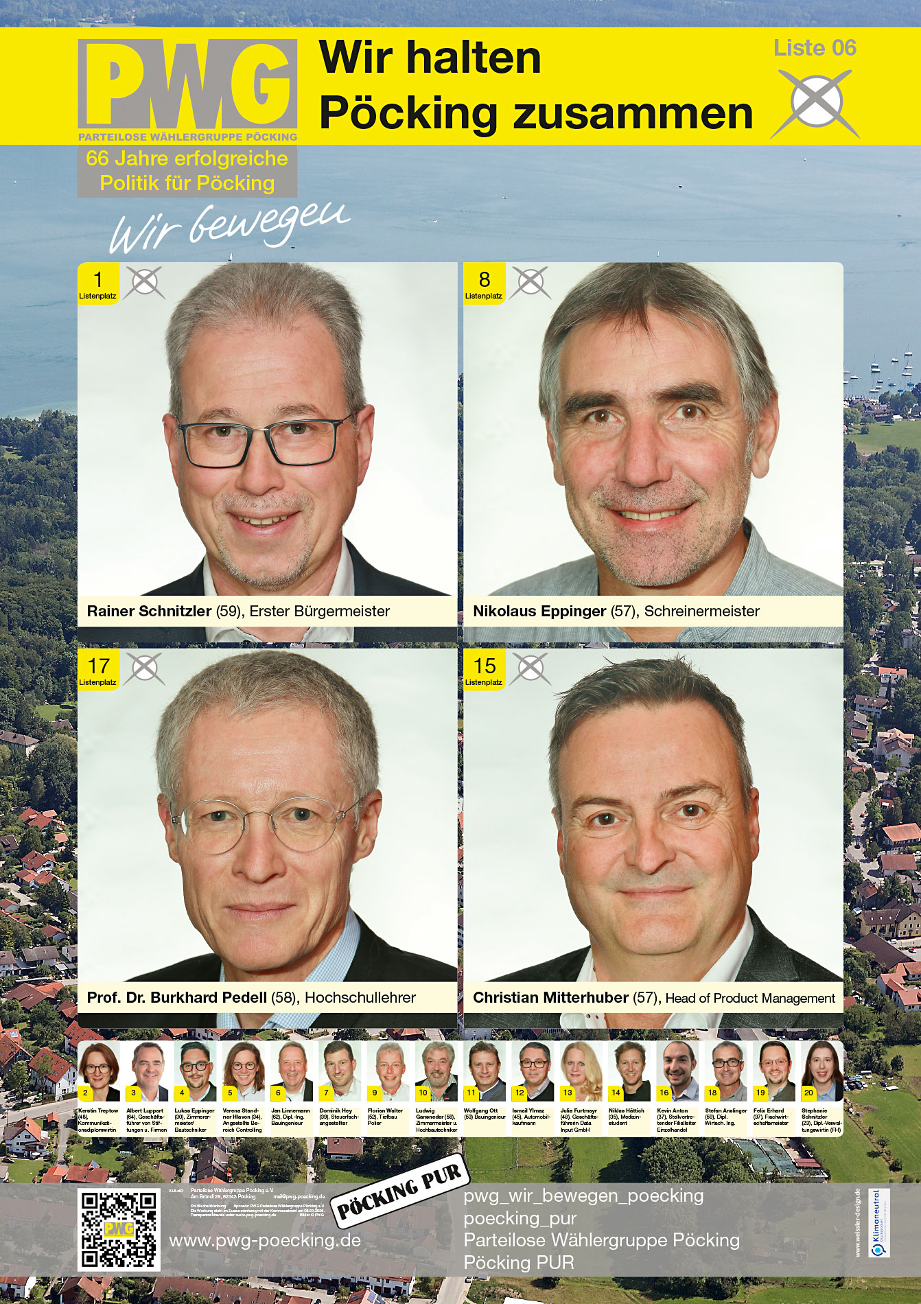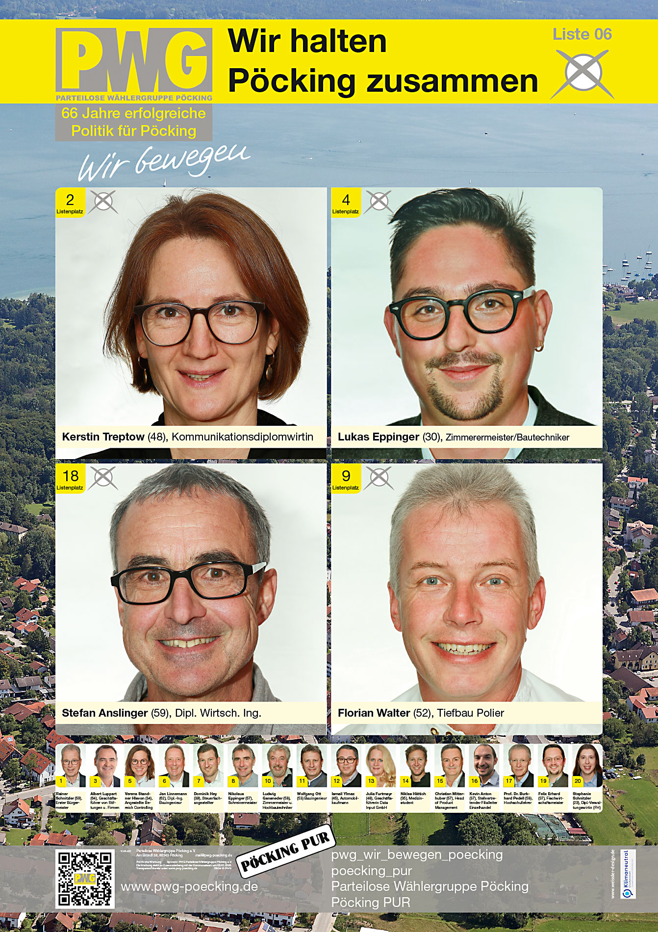 Seit ihrer Gründung vor 66 Jahren ist die Parteilose Wählergruppe (PWG) die prägende und bewegende kommunalpolitische Kraft in Pöcking. Uns war es wichtig, grundsätzlich unabhängig zu sein von den Vorgaben einer politischen Partei. In der Kommunalpolitik sollten ausschließlich die Belange der Gemeinde und ihrer Bürger im Mittelpunkt stehen – und auch heute noch ist dies unverändert Maßstab und treibende Kraft unseres Handelns. Wir sind ausschließlich dem Wohle Pöckings und seiner Bürger verpflichtet und wollen uns diese Unabhängigkeit als freie Wählergruppe auch erhalten.